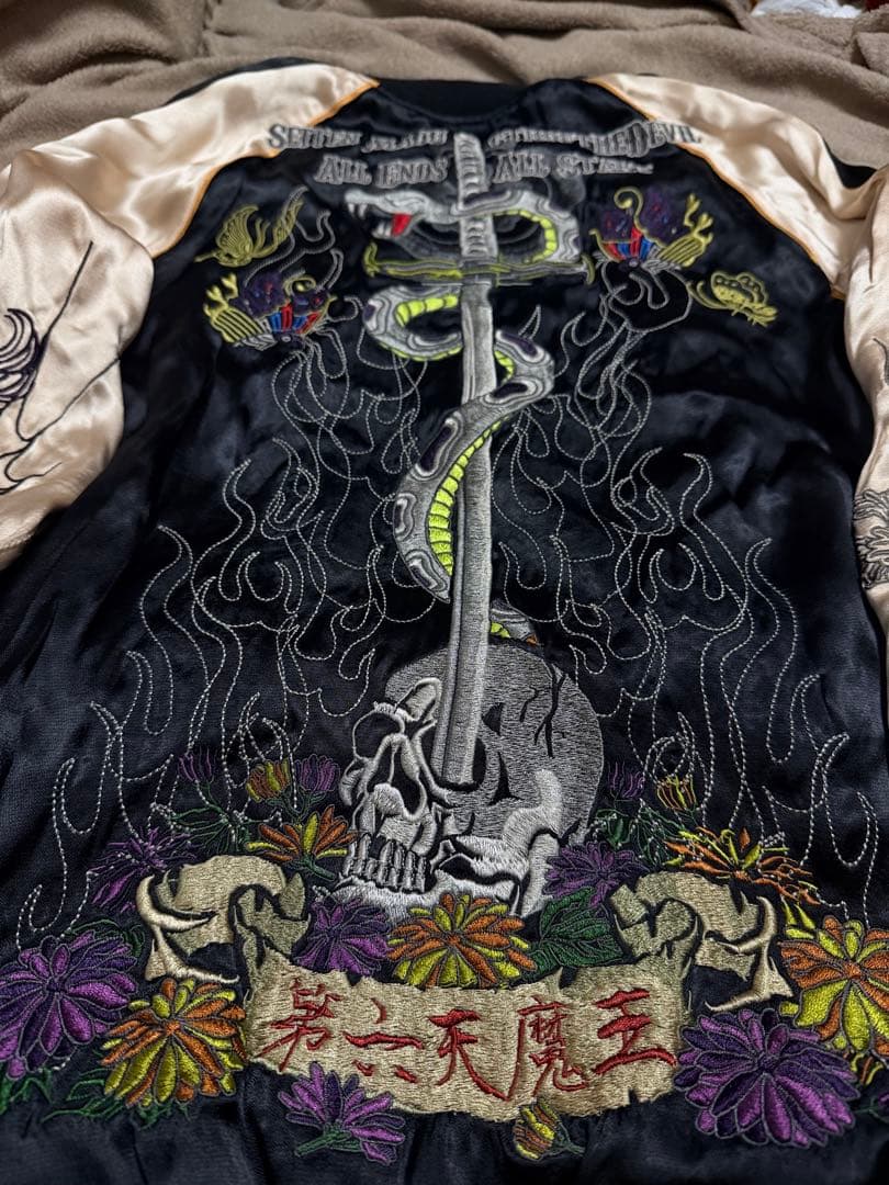ヴィンテージ スカジャン 髑髏 スカル 刺繍 リバーシブル キルティング M〜L ヴィンテージ市場で希少な、 スカルと蛇モチーフデザインの